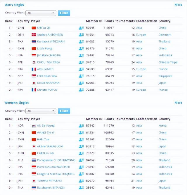 陈雨菲的世界排名还是第五没有任何变化,她的前面是山口茜、韩悦、王祉怡、安洗莹。