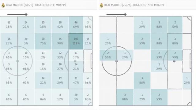 因为阿隆索明确告诉他,他不仅要撕咬对手,还要拥有自由。尽管数据样本尚少,但相比2024-25赛季,他的进攻区域分布变化显著(见表格)。如果说之前他更多集中在左路禁区内外,现在的姆巴佩更像全能球员。他在左路、右路和中路区域的次数相当(各3次)。虽然只是三场比赛,但意图明确:少做“9号”,多做“10号”。