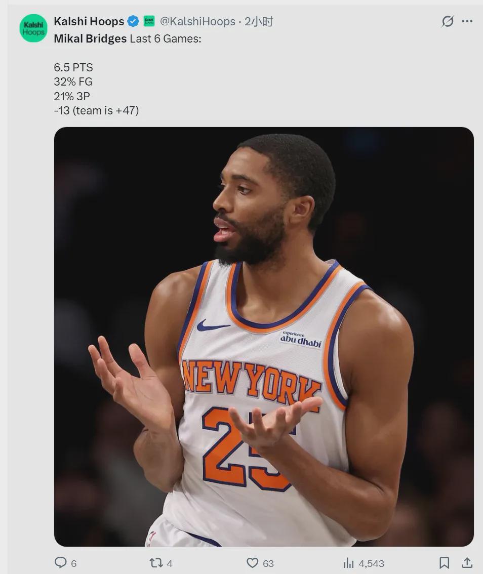 我们把范围扩大,最近6场比赛,大桥场均6.5分,投篮命中率32%,三分命中率21%,正负值合计-13。而尼克斯这6场一共净胜对手47分!大桥是一个防守尖兵,以往找不到手感,还能用防守帮助球队,可是最近他的防守也不行了。
